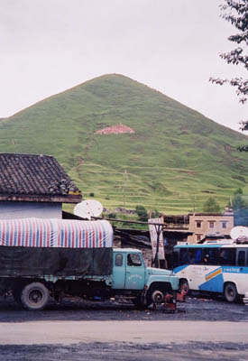 A pit stop along the road to Tuanji. Tibetan prayer flags can be seen on the hill.