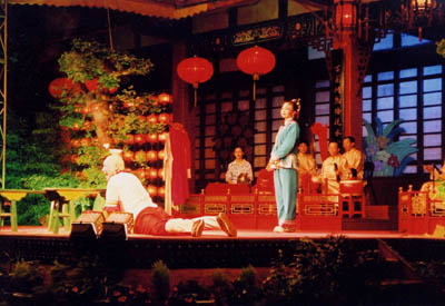 The Sichuan Opera, Chengdu. The husband is forced to balance a lit oil lamp on his head by his vengeful wife.