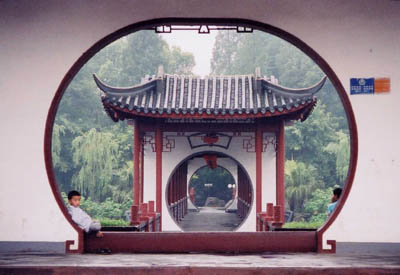 An ornate bridge leading to a island park in Chengdu.